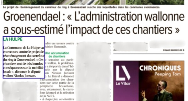 L’Avenir 27/03/26 : Inquiétudes en bordure du Ring à l’annonce du chantier à Groenendael : « L’administration wallonne a sous-estimé l’impact »