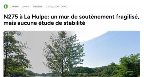 L’Avenir 03/03/26 : N275 à La Hulpe: un mur de soutènement fragilisé, mais aucune étude de stabilité