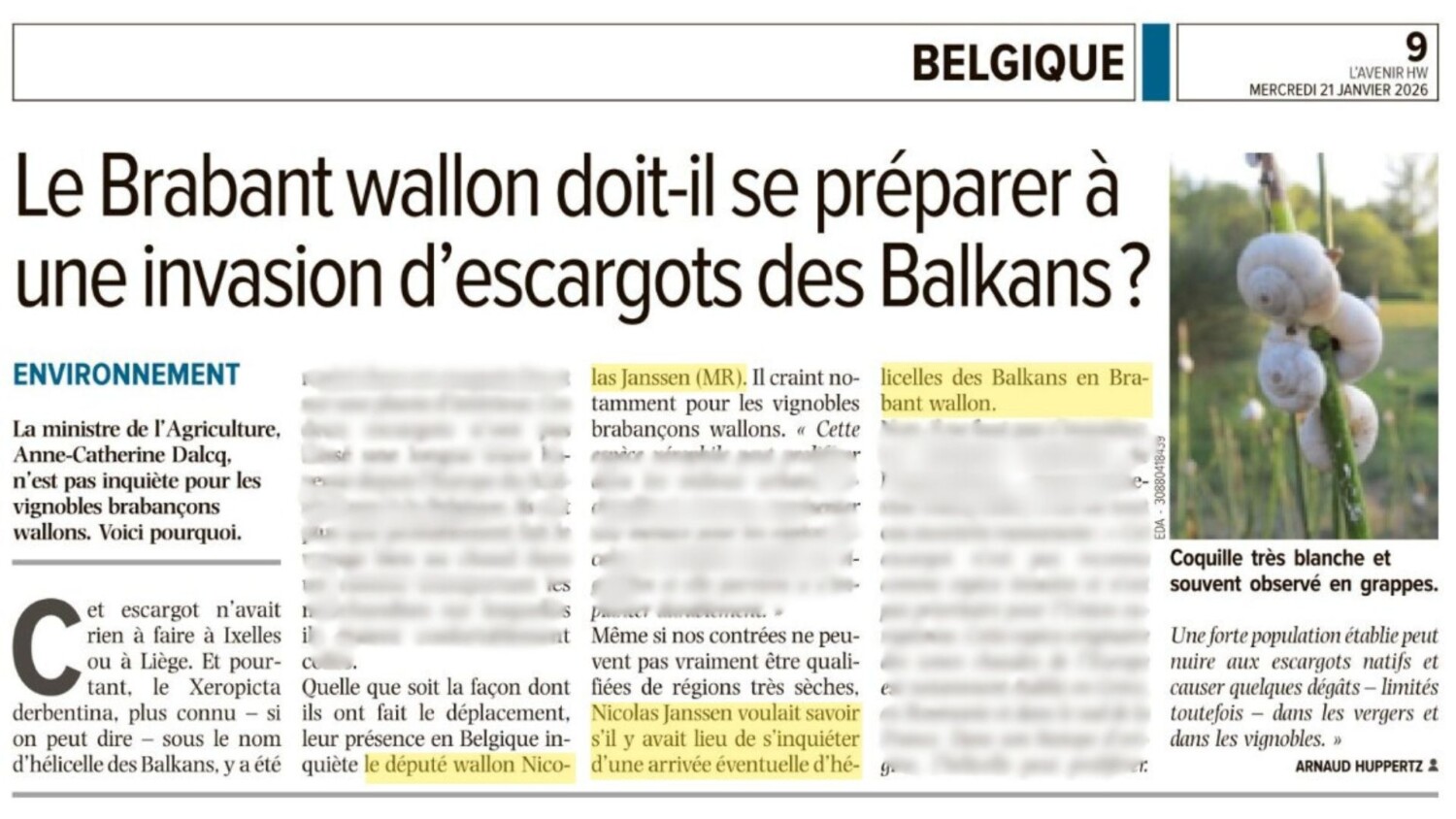 L’Avenir 20/01/2026 : Le Brabant wallon doit-il se préparer à une invasion d’escargots des Balkans ?