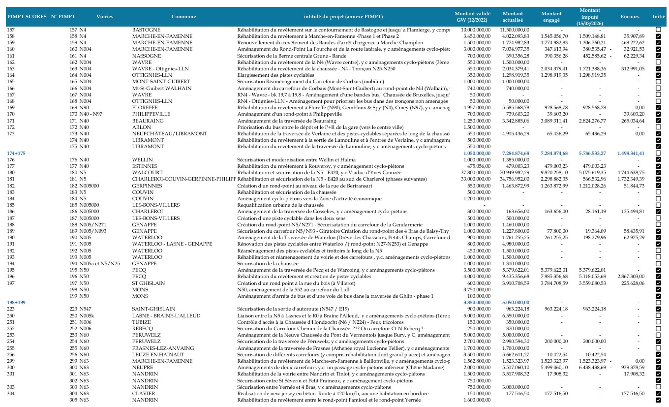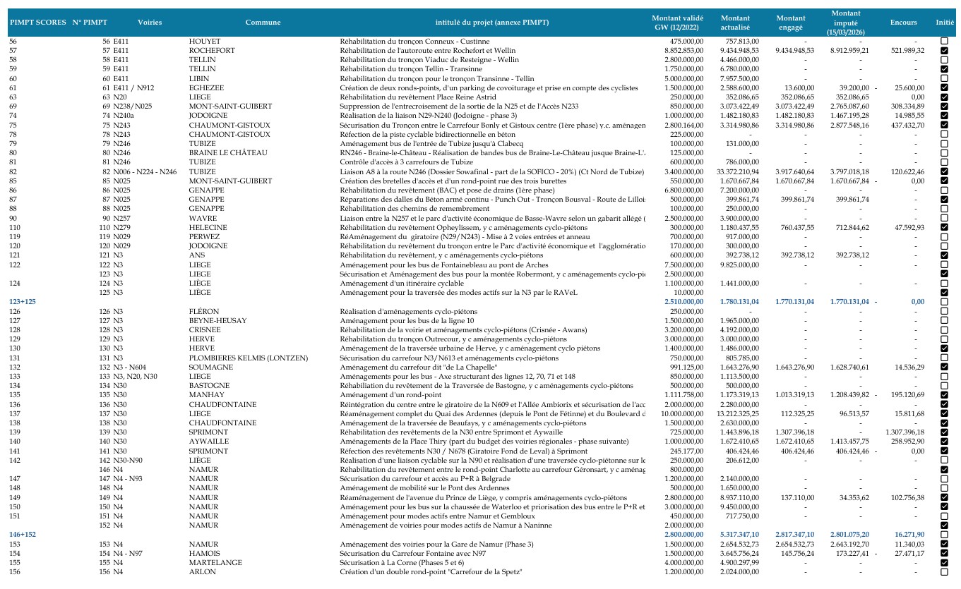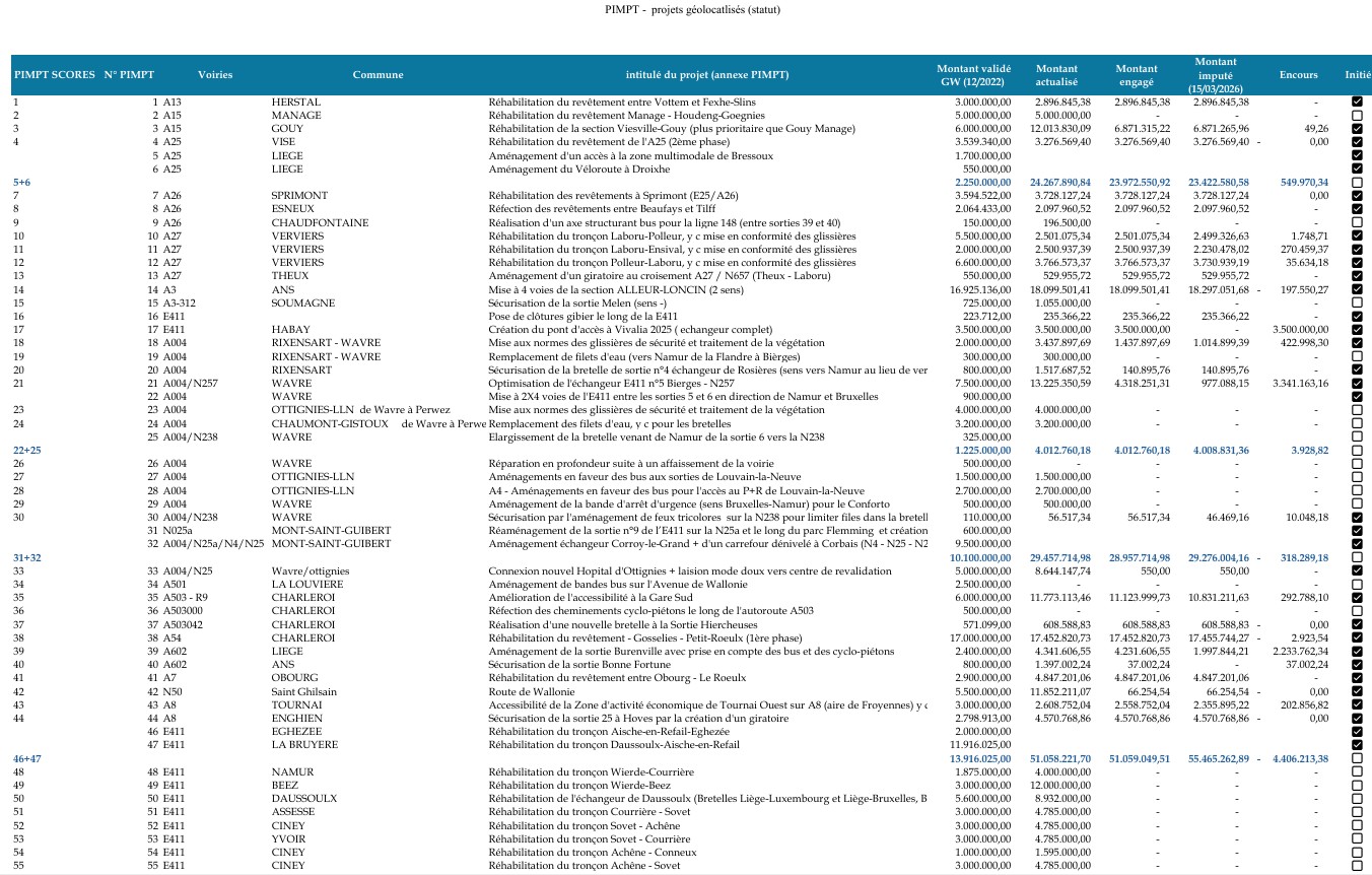 Or, entre le Service public de Wallonie Mobilité et Infrastructures (SPW MI) et la Société wallonne de financement complémentaire des infrastructures (SOFICO), la lisibilité de l’avancement reste limitée.