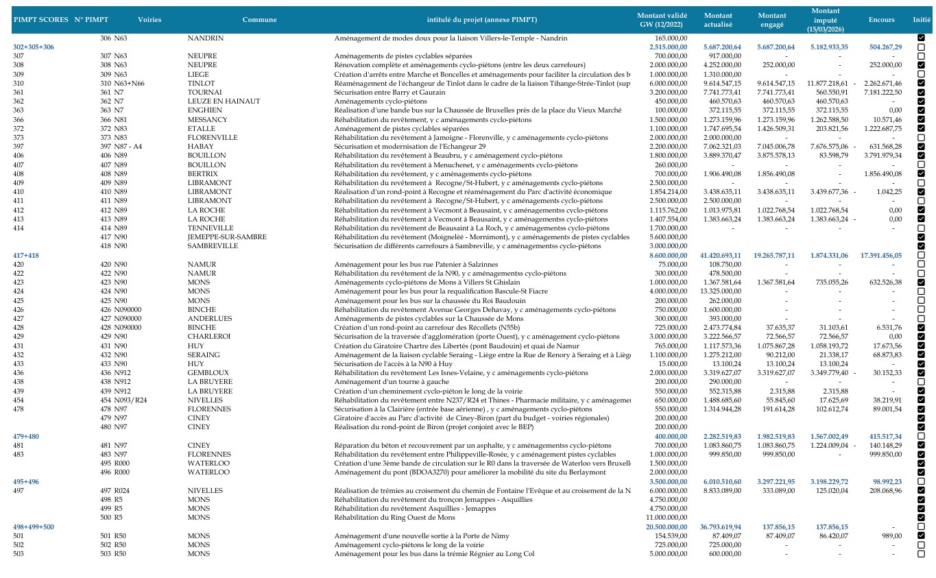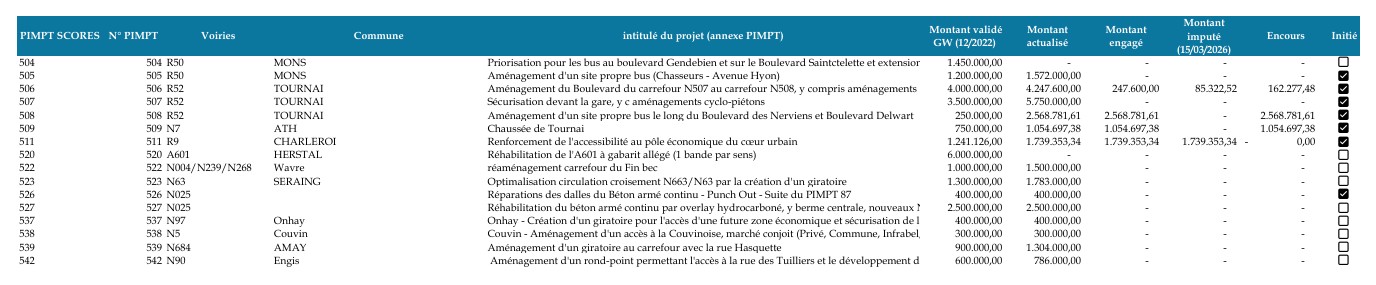 M. François Desquesnes, Ministre du Territoire, des Infrastructures, de la Mobilité et des Pouvoirs locaux. – L’honorable membre trouvera en annexe l’état des lieux présenté au Conseil d’administration de la SOFICO en ce qui concerne les projets géolocalisés inscrits au PIMPT du précédent Gouvernement sur le réseau structurant.